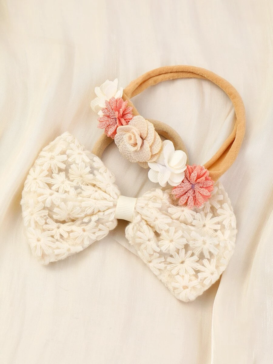 Set includes 2 headbands on delicate elastic in pink and cream.