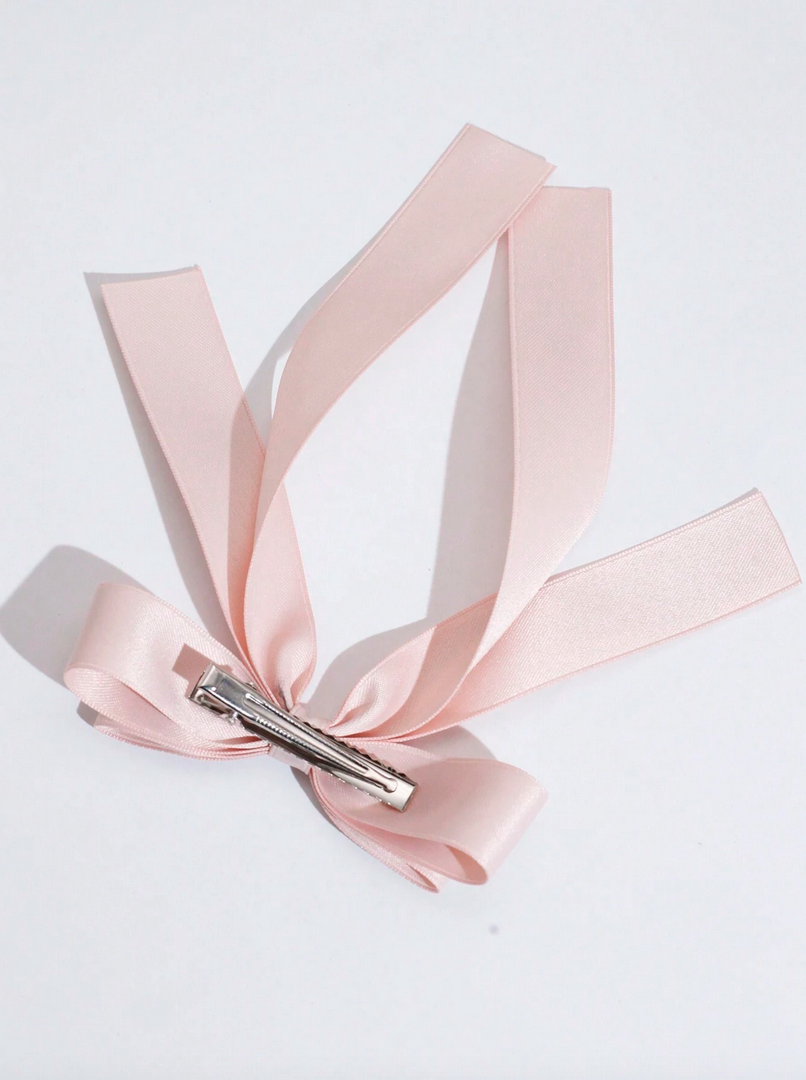 Discover the elegant satin hair bow in a subtle pink hue, the perfect accessory for any girl's outfit. This charming piece features a classic design, making it suitable for everyday wear as well as special occasions like family celebrations, parties, or photoshoots.