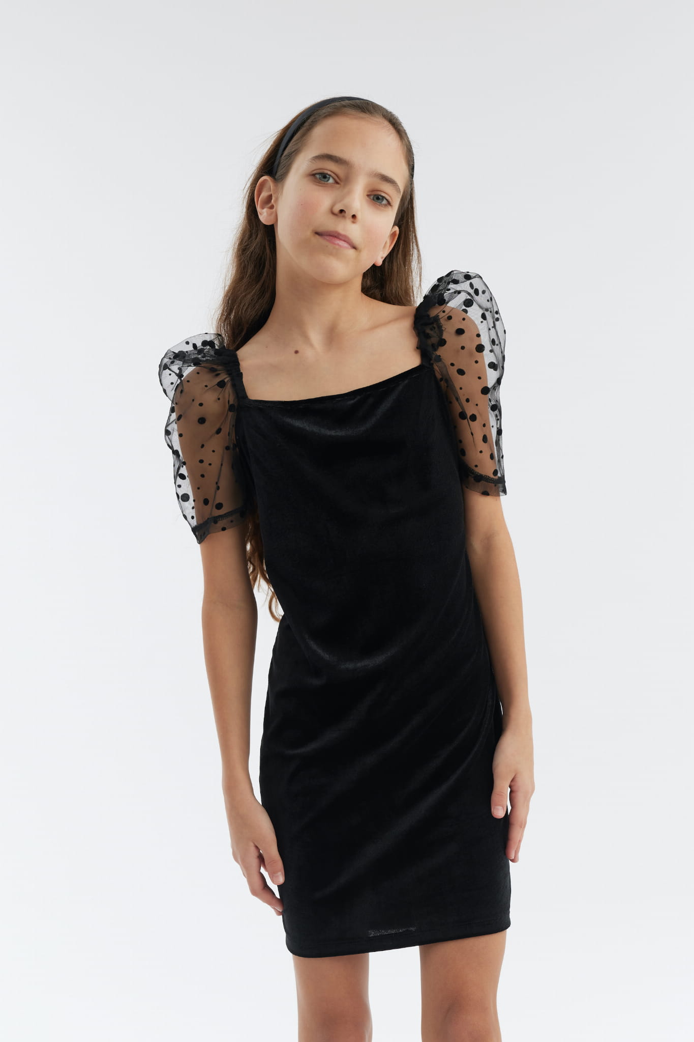 The extraordinary charm of the dress is enhanced by puffed sleeves decorated with dots.
