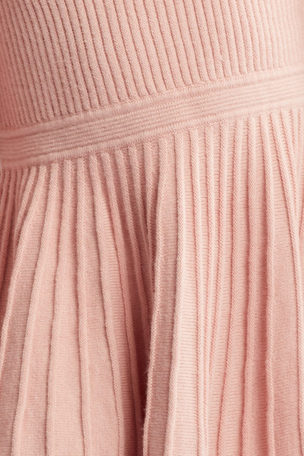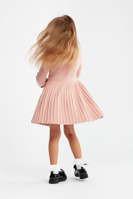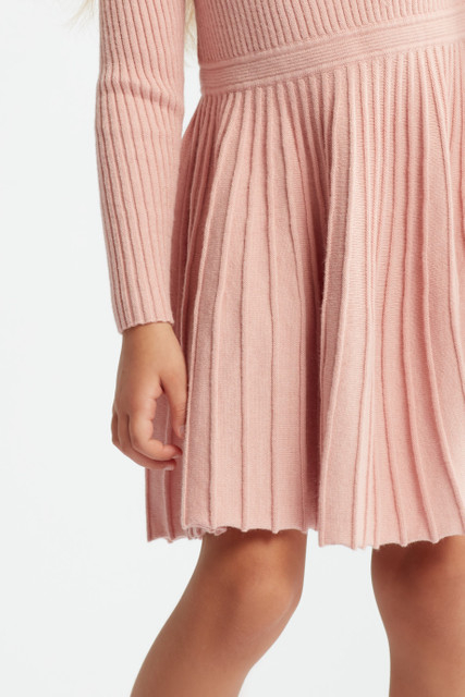 Round neck ribbing, long sleeves, a cut-off waist and pleats at the bottom give it a unique charm.