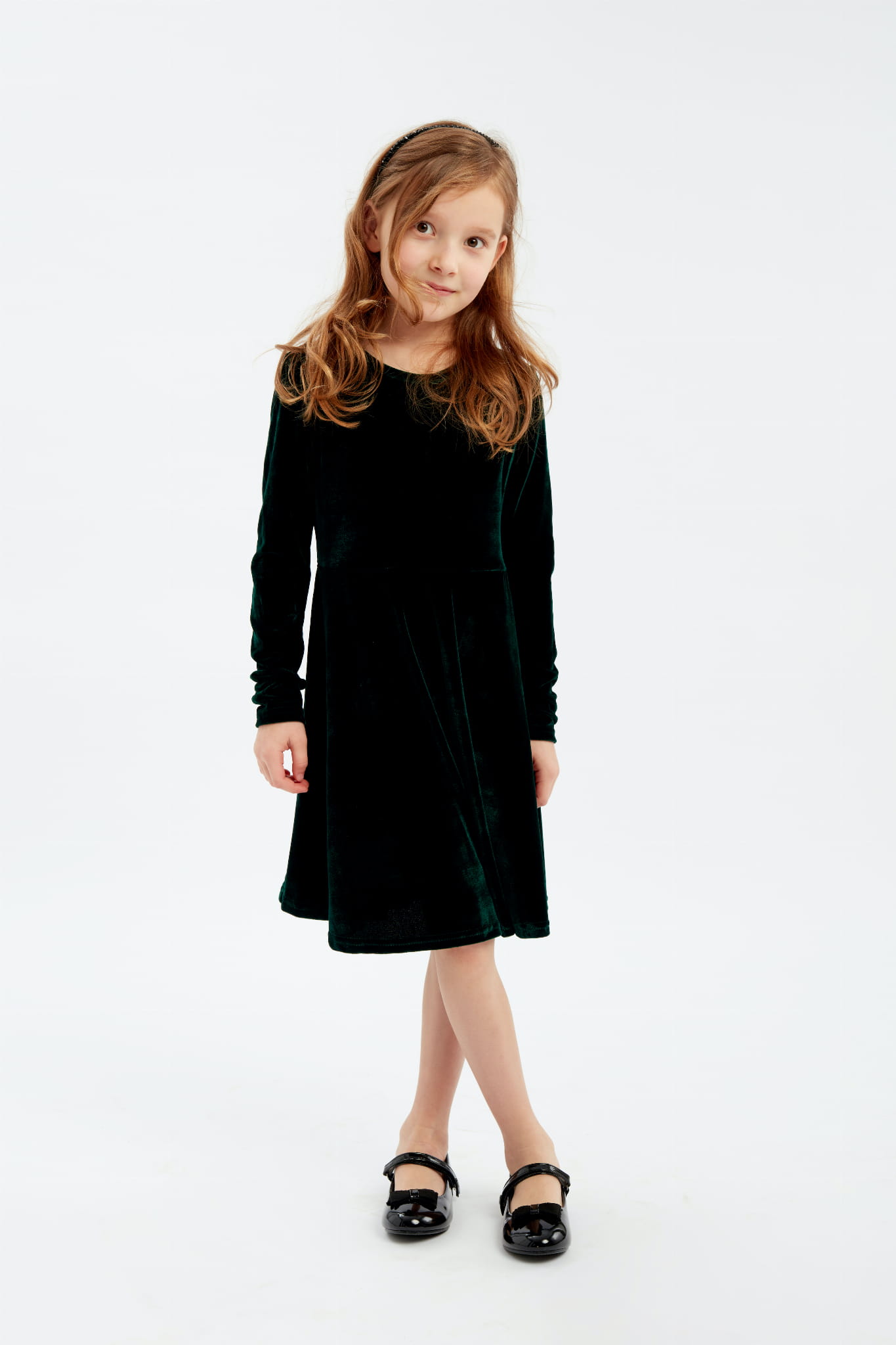 The unique velor fabric and girlish cut give the dress its unique charm.