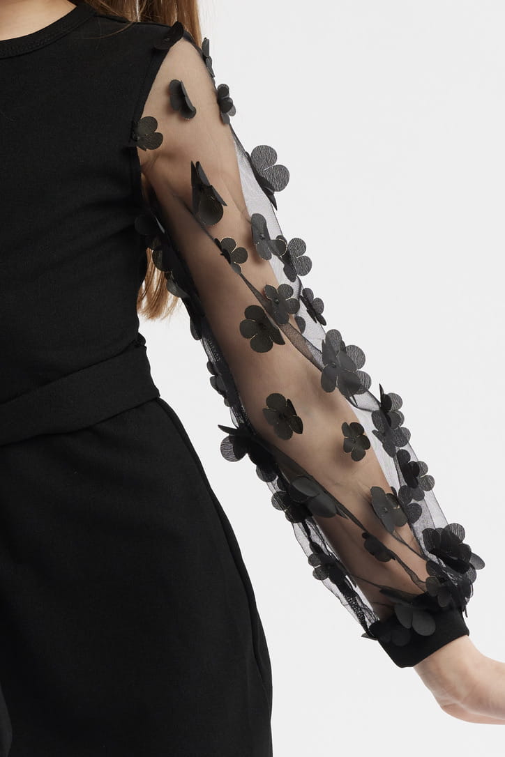 The unique tulle sleeves, covered with sewn flower petals, add an extraordinary charm to the dress.