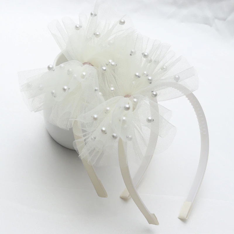 Beautiful, tulle hair band in the shape of a bow, decorated with pearls.