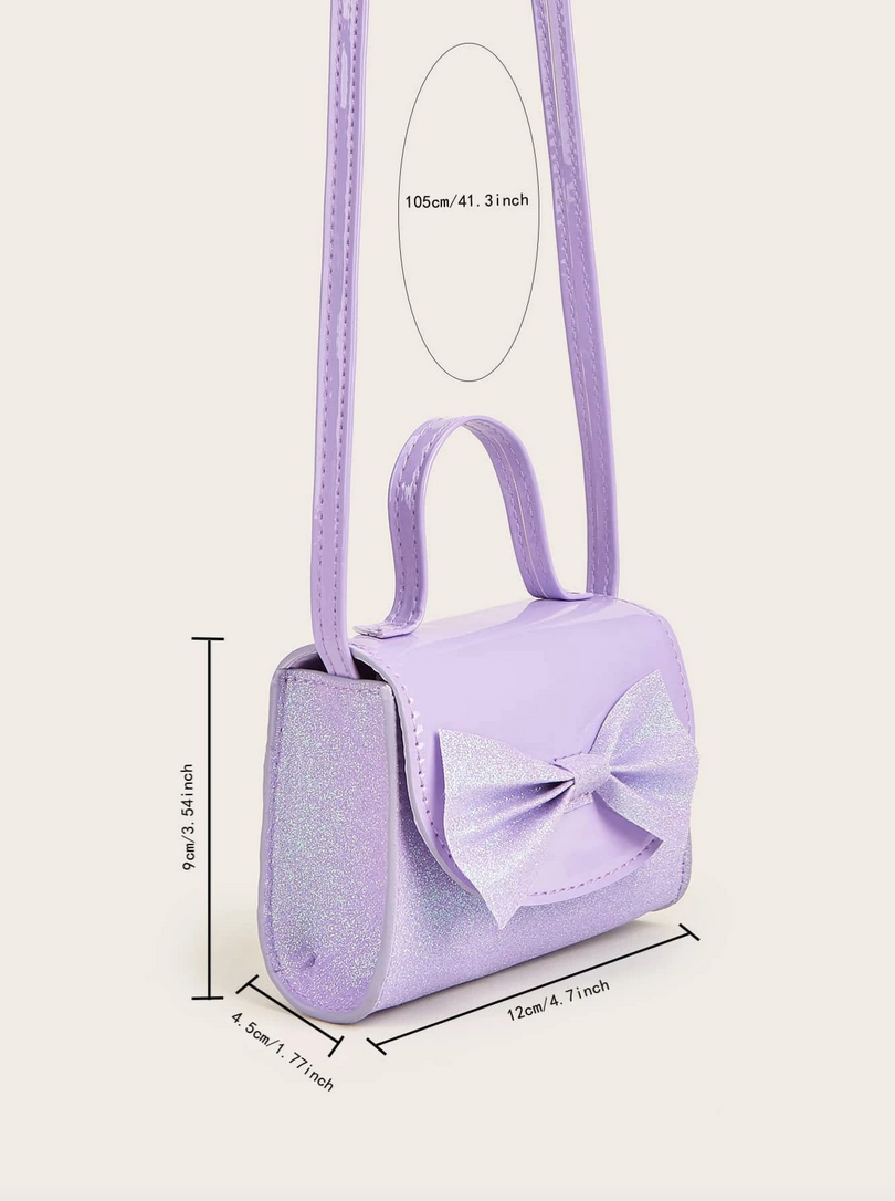 The handbag stands out with its delicate lavender colour, adding a sense of lightness and a romantic touch. The surface glimmers with a subtle sparkle, making it an ideal accessory for special events such as birthday parties, weddings, communions, or school dances. An elegant bow on the front flap enhances its charm, giving the handbag an even more stylish appearance.